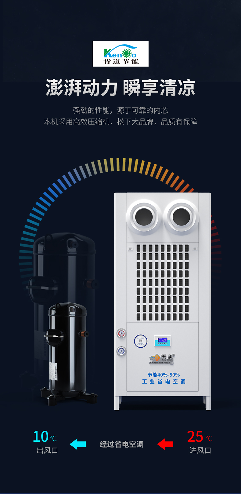 風冷式省電空調射流款JX-10D-旗艦款 風冷式省電空調射流款JX-10D-旗艦款 選用松下壓縮機 | 振動小,機器經久耐用 在制冷系統里,在區間內,壓縮機振動頻率越低,則噪音越低、對設備磨損越少,設備故障概率越低,制冷效率... 在線咨詢